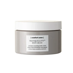 Comfort Zone TRANQUILLITY™ Body Cream to luksusowy krem do ciała o bogatej, jedwabistej konsystencji, który otula skórę, zapewniając intensywne nawilżenie i głębokie odżywienie. Formuła oparta na oleju z amarantusa oraz unikalnej mieszance olejków eterycznych, takich jak cedr, słodka pomarańcza, róża damasceńska, drzewo sandałowe, geranium i wetiwer, działa relaksująco na zmysły, przynosząc uczucie spokoju i harmonii. Idealny dla każdego rodzaju skóry, szczególnie suchej i odwodnionej, oraz dla osób przebywających w chłodnym, surowym klimacie.